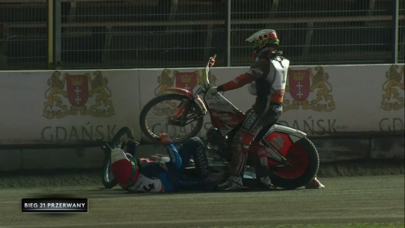 Ciasno po starcie i na pierwszym łuku leży Kacper Woryna. Powtórka we czterech.